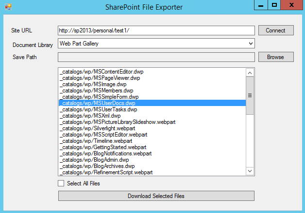 This Application is a Windows Desktop Application which allows you to download one or more files from a SharePoint Server to your local machine. This Application will need to run on the Server which runs the SharePoint Website, and you need to be logged into the Server as a User that has Administrative Access to the SharePoint site.