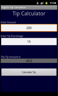 The DigiOz Tip Calculator is an application that allows you to quickly calculate how much you need to tip a waiter for a specified percentage (usually 15% unless you are cheap!). This program was written in Eclipse IDE using Android Development Tools and supports Android version 2.1 or higher.